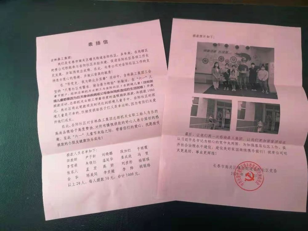 5月21日,吉林森工集团工会女工部联合岳阳社区共同开展了关爱辖区困境儿童活动。集团公司工会女工部组织机关女职工为岳阳社区5名困境儿童(这些困境儿童都是因为后天身体疾病或父母身体残疾造成的生活困难)开展捐款活动,此次活动共募集善款1000元,通过岳阳社区已将此笔款项及时送达到困境儿童手中。被关爱儿童家庭及岳阳社区对吉林森工集团总部机关女职工助人为乐的高尚品德给予高度赞扬,对所有捐款的女职工们表示诚挚的感谢。